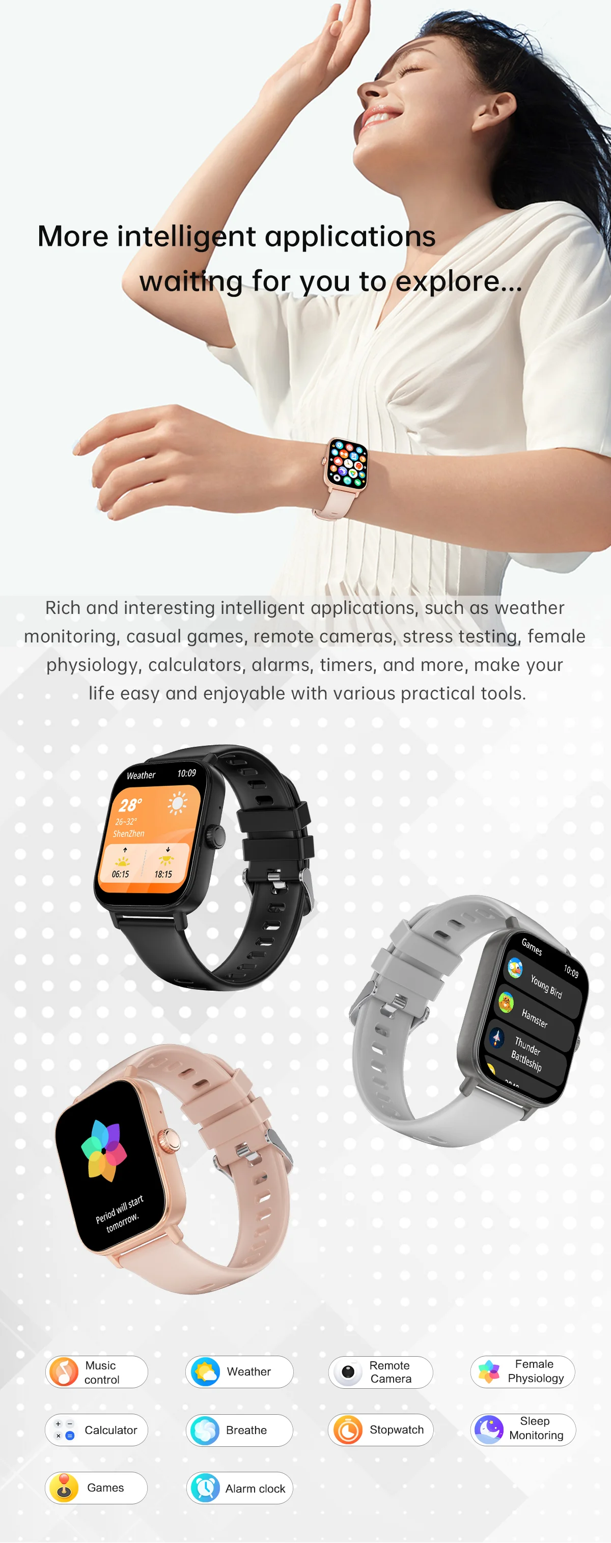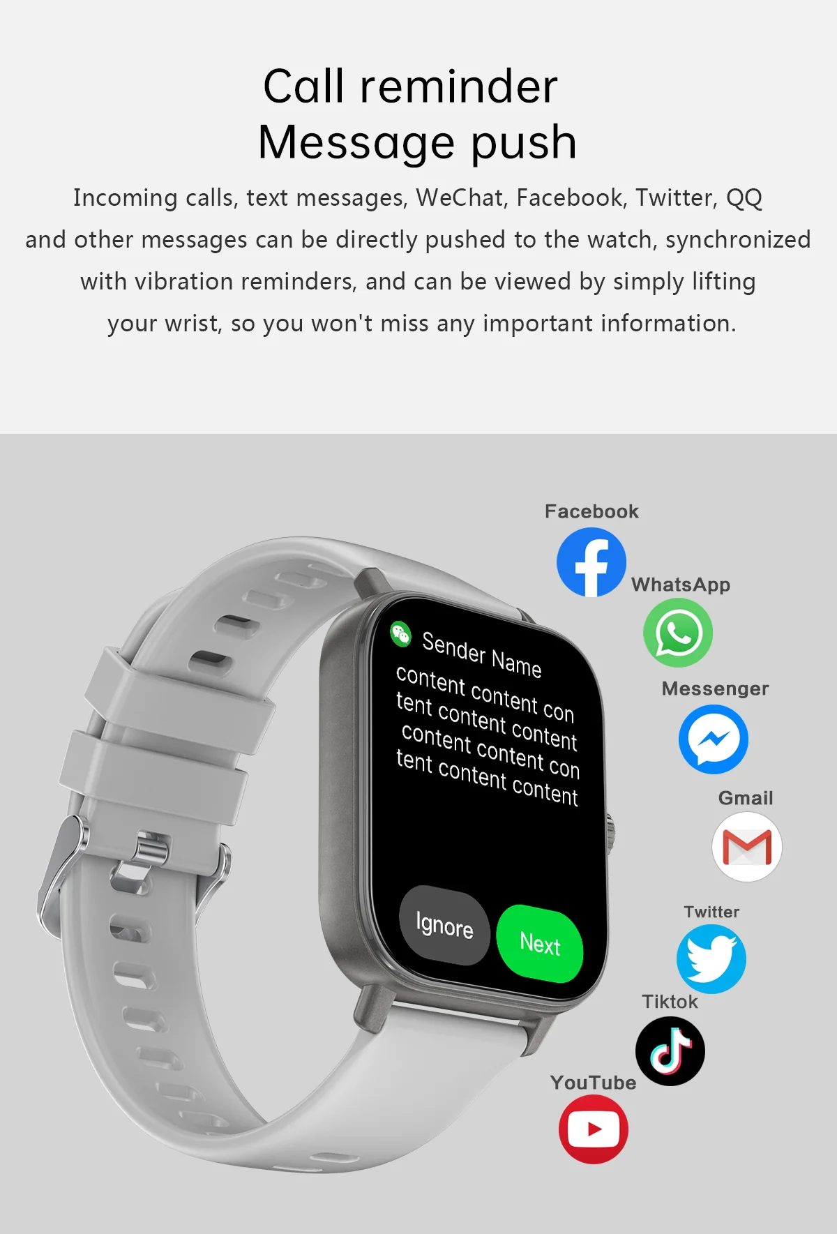 function: chronograph,Music Player,Answer Call,Call Reminder,Fitness Tracker,Payment,SOS button,Activity Tracker,Multisport Tracker,Alarm Clock,Sleep Tracker,Heart Rate Tracker